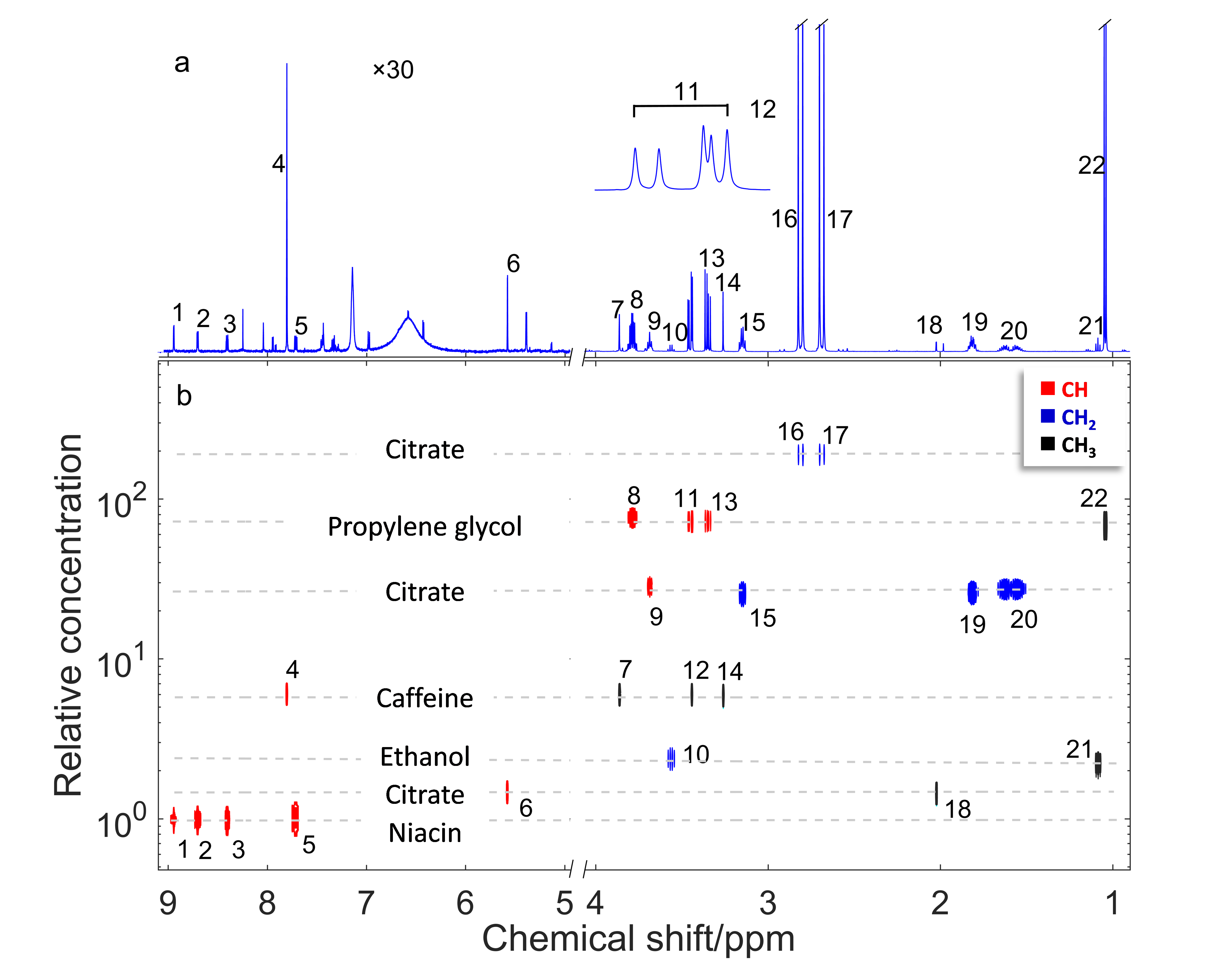 CORDY给予了一种新的、集复杂体系谱峰分离和定量分析于一体的二维NMR谱构建方法。所依据的原理是NMR谱峰面积与浓度和相应的原子核自旋数目(如1H-NMR中的质子数)成正比,共振吸收系数对不同分子和不同官能团具有等价性。该工作顺利获得数据计算,把这一基本原理顺利获得二维谱的方式呈现出来。应用CORDY方法从一张一维 NMR谱就能同时实现不同分子NMR谱峰的识别、分离和含量测定。把CORDY与其它NMR方法(如DOSY)联用,拓展为三维方法(如CORDY-DOSY),能进一步提升分离分析效率。