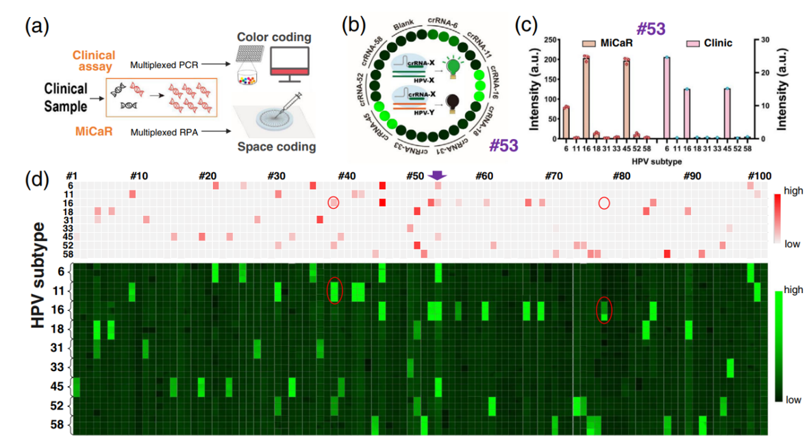 研究团队利用微流控芯片“空间编码”技术,并结合CRISPR和恒温扩增RPA技术,开发了一种多靶标核酸检测技术平台“MiCaR”(Microfluidic device integrated with CRISPR-Cas12a and multiplex RPA),该方法在40分钟内可检测多达30种不同的病原体,灵敏度可达0.26 aM。研究人员以常见的9种HPV亚型为例进行了系统的研究和方法表征。由于HPV各亚型间核酸序列差异很小,为避免交叉识别,研究人员对RPA引物和crRNA进行了系统的设计和多轮筛选并找出了最优组合;研究团队利用前期发现的新型CRISPR报告分子DNA G-三链体,顺利获得9×9矩阵式交叉测试实现了9重靶标的准确鉴别。
