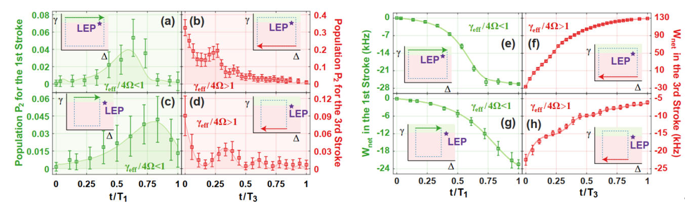 本项工作中,研究人员第一时间借助单个超冷40Ca+离子的三能级结构,精准地确定了LEP及其精确相和破缺相的实验参数;随后,顺利获得调控外加光场的频率失谐量,实现了环绕与不环绕LEP的两类量子热机循环。实验所演示的量子热机包含等耗散压缩、等失谐加热、等耗散膨胀和等失谐冷却等四个冲程,其中,等耗散压缩处于破缺相,等耗散膨胀处于精确相(见图二)。多次实验的结果显示,不环绕LEP的量子热机循环有可能做负功;但环绕LEP的量子热机循环则始终做正功(见图三)。基于严格的数据分析并与数值模拟比对,研究人员最终确认,LEP相关的拓扑性质具有热力学特性,可以应用于有效增强量子热机的输出功和效率。