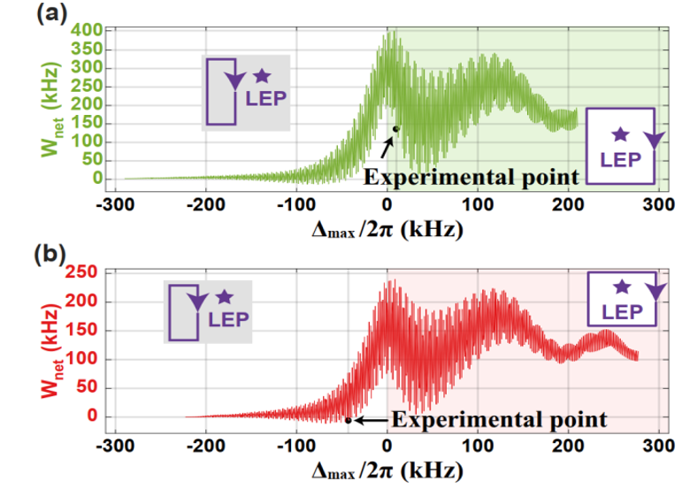 环绕和不环绕LEP的净功输出。(a) 环绕LEP的热机循环不仅确保热机循环始终输出正功,而且可以增强净功输出。(b) 不环绕LEP的热机循环的输出功有正有负
